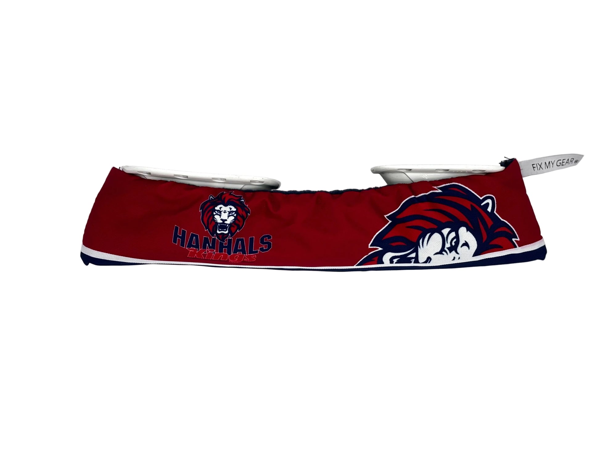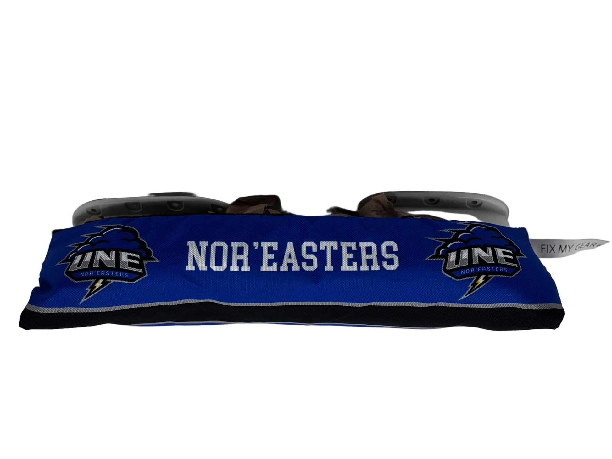 Our custom skate guards features a heavy polyester shell reinforced with a heavy polly webbimiddle strip. The inside is lined with 18oz fleece liner and reinforced with 1.5 inch polly webbing centre strip. These Guards are fully customizable. Please email us your logos in AI or Pdf format . email info@fixmygear.com